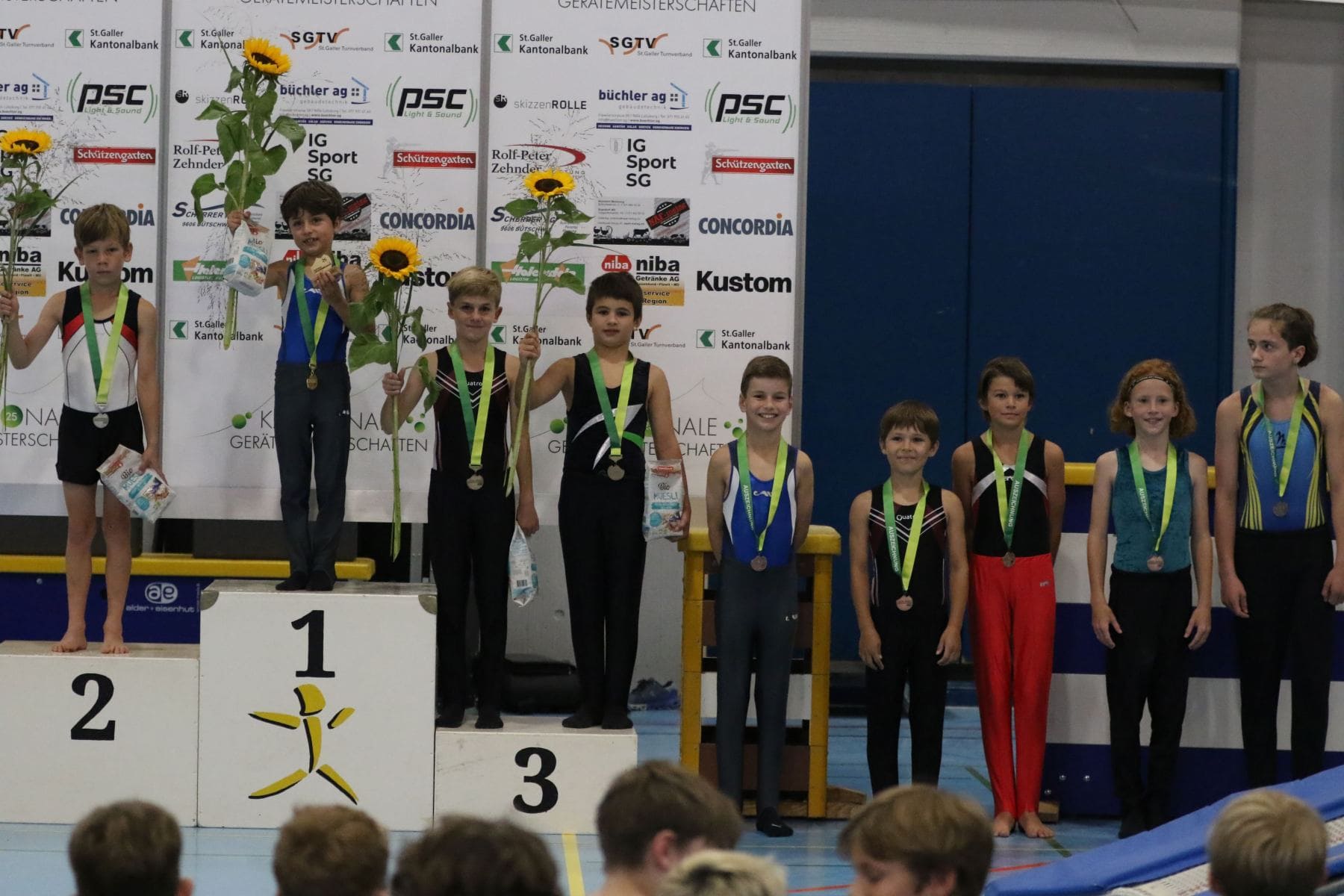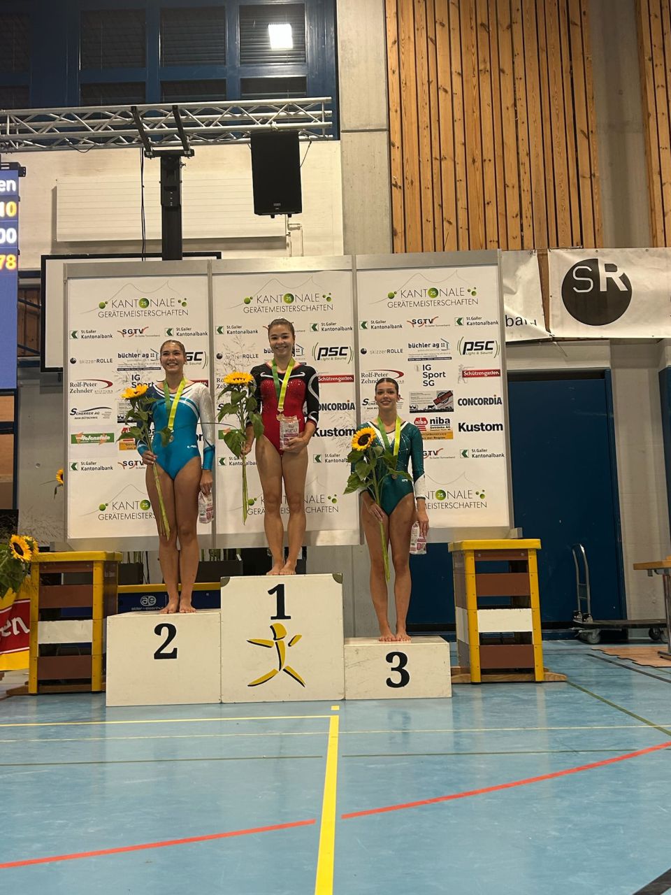 K6 – Mit einer sensationellen Gesamtpunktzahl von 38.10, was einen Notenschnitt von 9.52 ergibt, gewann Anja Wiebe ihre Kategorie, somit ist sie St. Galler Kantonalmeisterin in der Kategorie 6. Besonders erwähnenswert ist ihre Note an den Ringen mit 9.90. Auch Leonie Aebi hatte einen guten Wettkampf und durfte sich auf dem 22. Rang mit einer Höchstnote von 9.60 an den Ringen eine Auszeichnung umhängen lassen. Jelena Fischbacher verpasste die Auszeichnung knapp auf dem 36. Rang sowie Coleen Steiner auf dem 57. Rang.