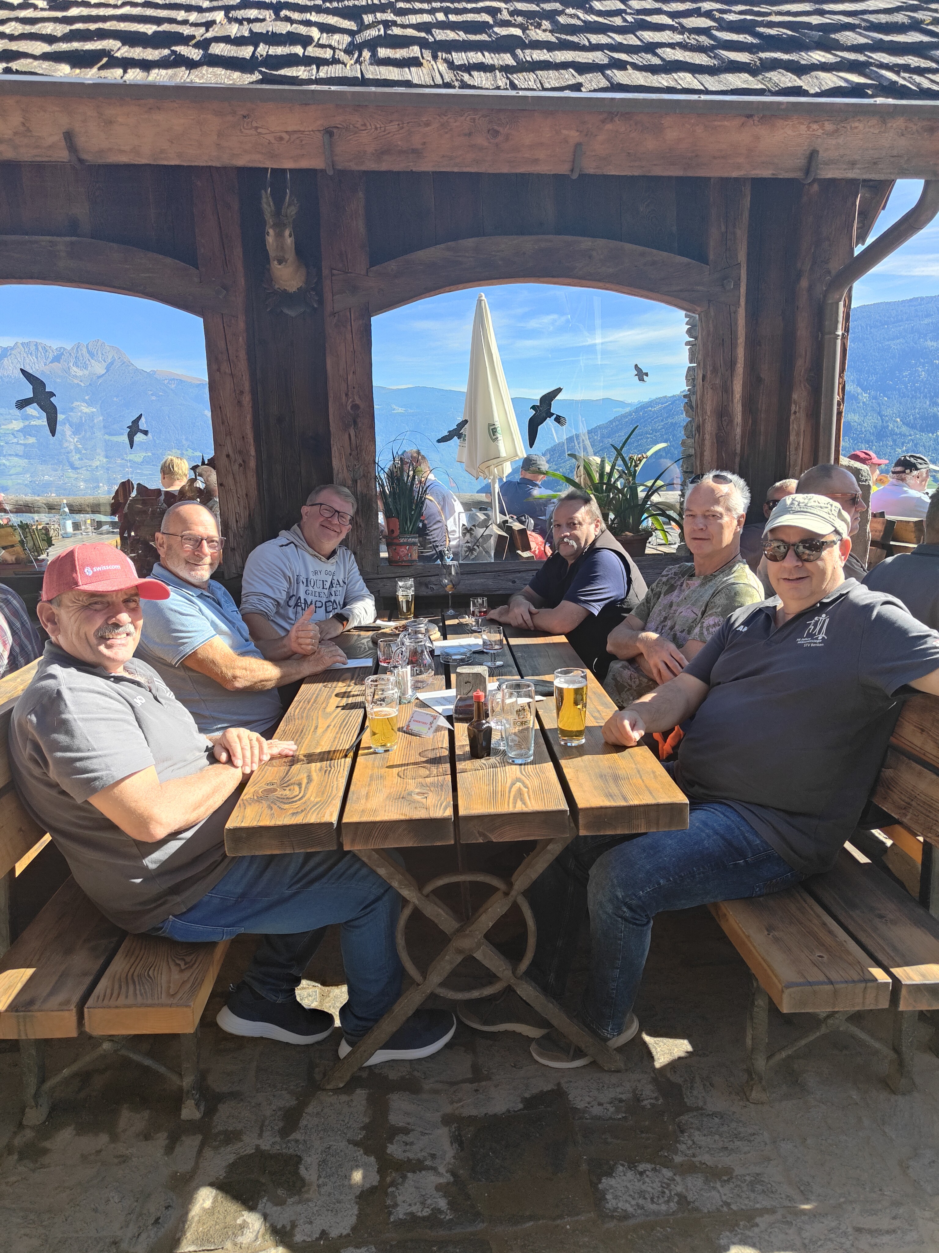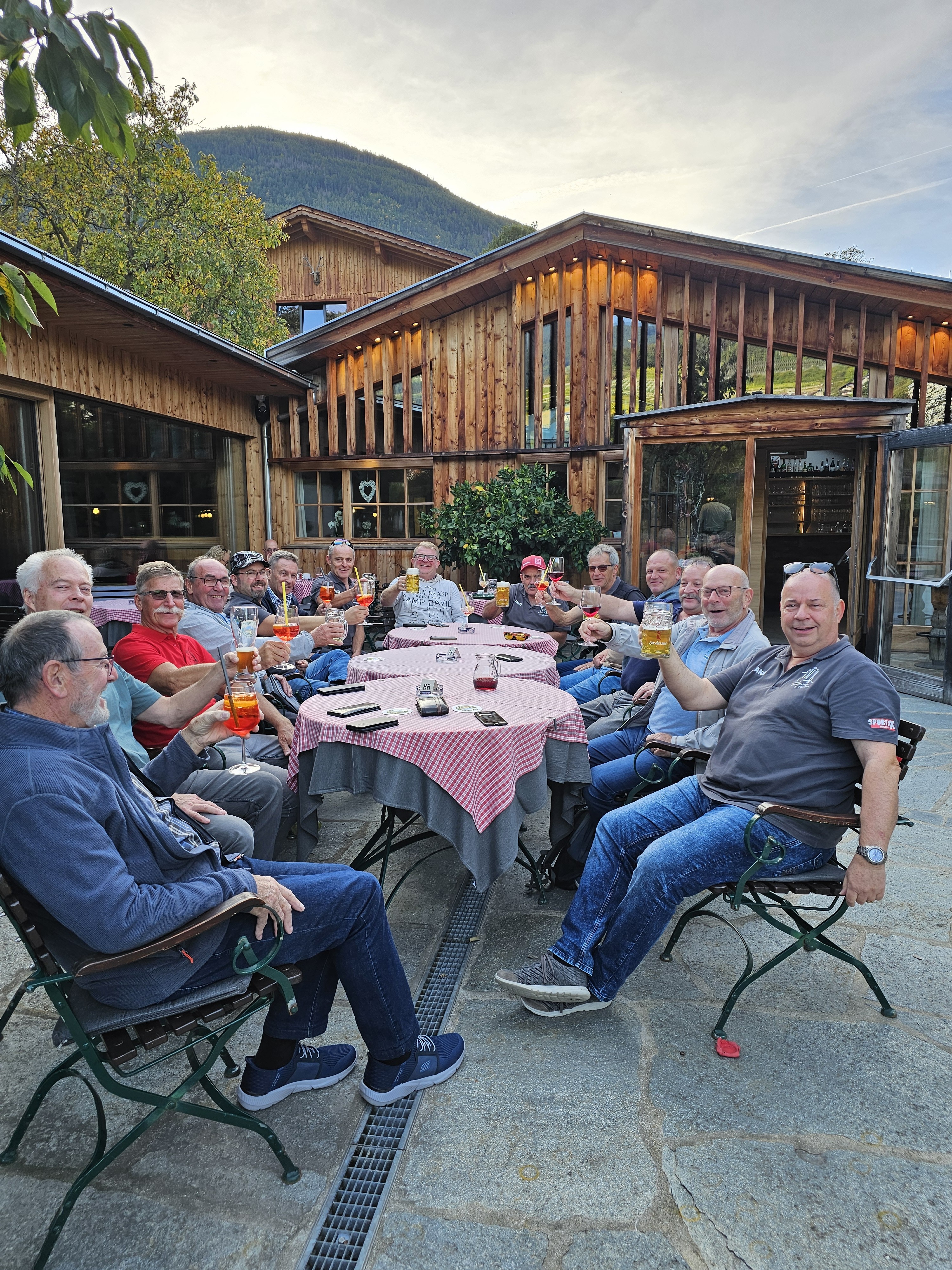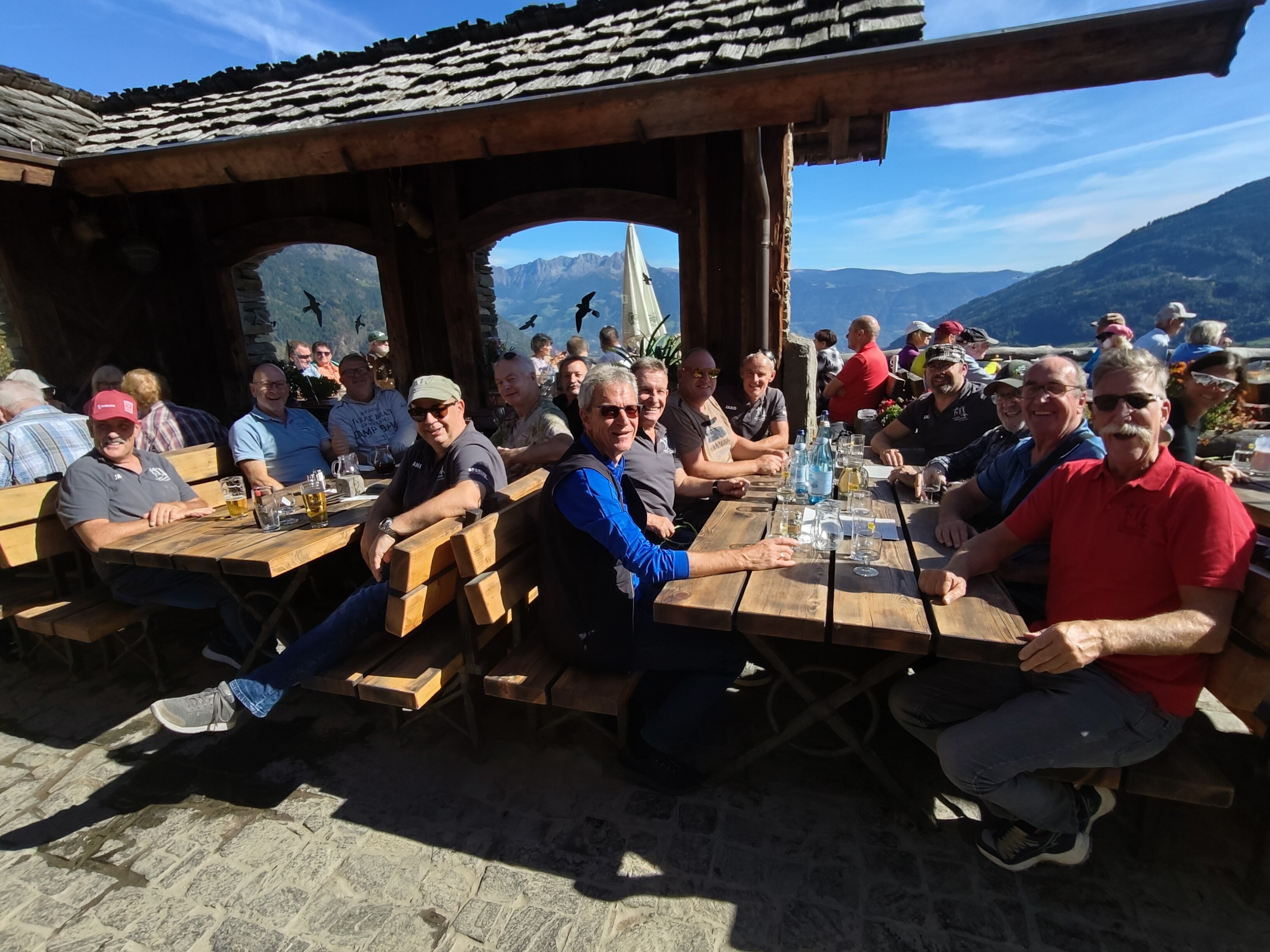 Auf vielfachen Wunsch von diversen Mitgliedern führte uns unsere Vereinsreise ins schöne Südtirol. Damit man dieses in voll Zügen geniessen kann, verlängerten wir die Reise um einen Tag und fuhren bereits am Freitagmorgen los. Nach dem Vereinatunnel gab es einen Kafi-Halt in Zernez. Anschliessend überquerten wir schon bald die Landesgrenze und wir befanden uns im Vinschgau/Südtirol. Für das Mittagessen anzusteuern, waren alle Fahrkünste unseres Chauffeurs Hübi gefordert. Damit wir die Jausenstation «Dursterhof» in, resp. oberhalb Partschins erreichen konnten, ging es erstens durch schmale Gässchen, enge Kurven im Dorf und dann eine steile, holprige Bergstrasse hoch. Einige der Mitreisenden zweifelten bereits, ob wir jemals ans richtige Ort kommen würden. Bei der Jausenstation angekommen, waren dann aber alle von der Lokalität begeistert: wunderschöne Aussicht ins Vinschgau, schöne Terrasse, gutes Essen, aufgestellte Bedienung – und zum Schluss ein feines «Schnapserl» auf Kosten des Hauses. Im Innern des Hauses wird aktuell ein Eventlokal gebaut. Bis alles fertig ist, dauert es ca. noch 2 – 3 Jahre. Aber man kann sich jetzt schon vorstellen, was für ein Bijou am Schluss entstehen wird. Dass dann beim Abfahren ein Lamborghini neben uns stand, erstaunte uns alle.